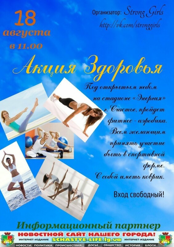 Группа Strong Girls проводит Акцию Здоровья. Мы приглашаем всех девушек, женщин уделить всего час своей фигуре, а именно под открытым небом позаниматься фитнес – аэробикой. За это время вы потратите немало калорий, поправите свое здоровье и улучшите себе настроение. Вход свободный, будьте в спортивной форме, или просто в удобной одежде, при себе иметь коврик.