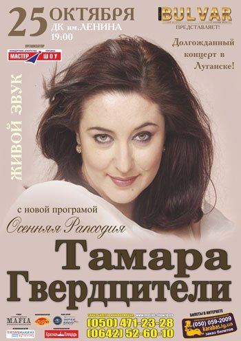 Тамара Гвердцители - уникальная певица, которой удается сочетать в своем творчестве традиции мировой классики и современной эстрады. Главная особенность певицы – это сильный проникновенный голос с неповторимой гаммой оттенков, покоривший легендарные концертные залы: парижскую «Олимпию» и нью-йоркский «Карнеги-холл».