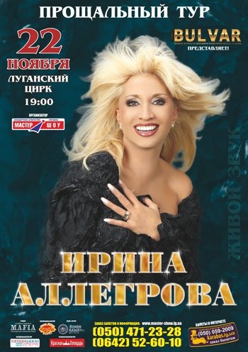 Весной 2012 певица со сцены объявила о том, что заканчивает и начала прощальное турне — в течение почти года звезда будет ездить по городам России, Европы, Америки и, конечно, стран СНГ. Купив билет на концерт Ирины Аллегровой, вы сможете услышать самые популярные хиты певицы и подарить свои аплодисменты одной из самых ярких звезд эстрады.