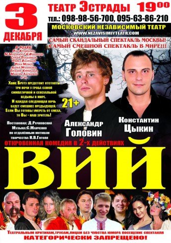 В Луганске будет показан спектакль «Вий», который поставлен по мотивам всем известного бессмертного произведения Николая Гоголя. Вы обязательно должны попасть на эту постановку хотя бы потому, что ничего подобного вам раньше видеть не приходилось - изначально мистическое и местами даже жуткое произведение в интерпретации актёров Московского независимого театра и постановщика Д. Рачковского превращено в феерическую комедию, напоминающую своим стилем Comedy Club.