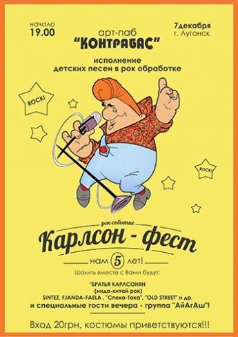 По старой традиции будут весёлые конкурсы (призы - банка варенья, конфеты и многое другое), а так же будет море шуток и новые рассказы о Карлсоне. Снова для Вас будут звучать по-взрослому любимые мелодии из детства, в исполнении рок и не очень, коллективов из Луганска и других галактик.