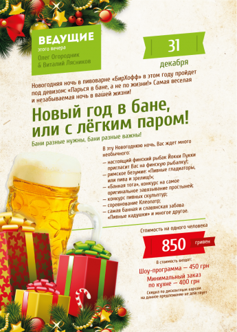 В ресторане «БирХофф» новогодняя ночь пройдет ярко и феерично под девизом «Парься в бане, а не по жизни!». Гостей ждет самая веселая и незабываемая ночь в жизни, неповторимая атмосфера, встреча с любимыми героями, неожиданные повороты сюжета, зажигательные ритмы и вкуснейшие блюда праздничного меню.