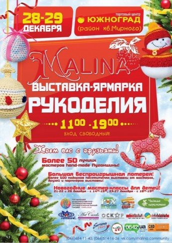 В Новогодней выставке-ярмарке Malina примут участие более 50 лучших мастеров рукоделия Луганщины, которые представят аудитории свои новые работы в самых различных техниках и стилях классических и современных направлений рукоделия (авторская бижутерия, скрапбукинг, тильды, тряпичные куклы, бисероплетение, мыловарение, натуральная косметика и многое другое).