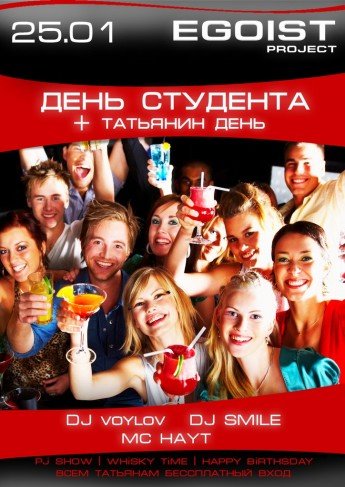 Мы снова собираемся все вместе чтобы хорошенько затусить! У нас на это есть очень весомый повод! Мы празднуем самый масштабный праздник - День студента и вдобавок еще Татьянин День!