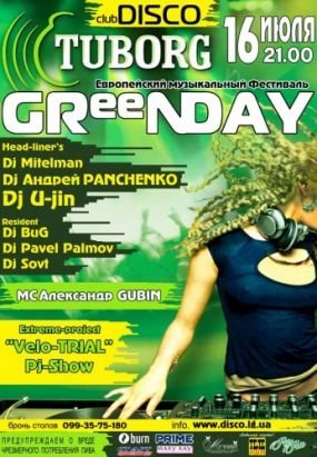 16 июля(пятница) 21.00 - т.м.TUBORG представляет - Европейский музыкальный фестиваль "TUBORG GReeN DAY" - in club DISCO!