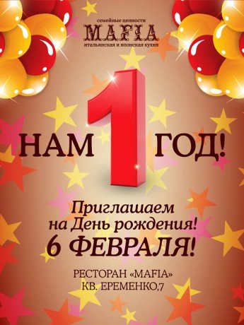 Февраль для ресторана «Mafia» - особенный месяц, ведь 6 числа мы отмечаем первый День Рождения! И по этому случаю готовим специальную, праздничную программу с подарками для наших гостей. В это день мы постараемся удивить и порадовать вас, ведь мы вас любим!