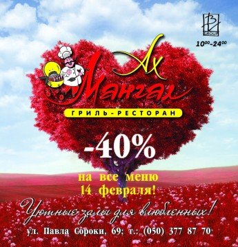 Таким приятным сюрпризом может стать посещение ресторана "Ах мангал Центр", тем более, что в этот день будет действовать специальная скидка -40% на все меню! А небольшие уютные отдельные залы сделают ваш романтический ужин незабываемым!