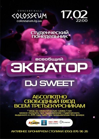 Всеобщий экватор! Приглашам всех студентов ярко отметить легендарный студенческий праздник - Экватор! Вы долго работали, настало время оторваться!