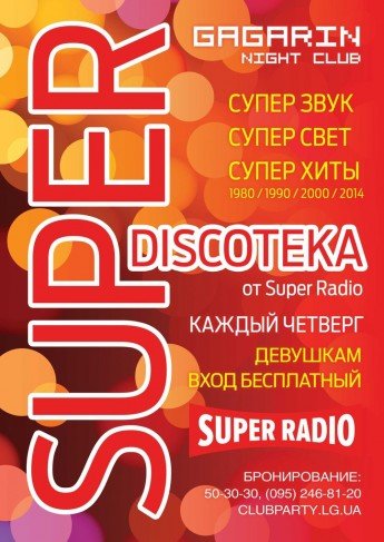 Ну и в самых главных: теперь по четвергам Супердискотека от Super Radio. Суперхиты 90-х и 2000-х в суперремиксах, которые микшируют супердиджеи Unity DJ's на супертанцполе клуба Гагарин. Любимые хиты, клубный бит и отличная атмосфера - это Супердискотека от Super Radio 101.1. Вы уже заказываете стол? Что ж, идея супер!