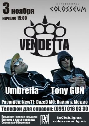Группа "Vendettа" (г. Харьков) с большим концертом! В этот вечер прозвучат лучшие песни со всех альбомов группы! Не пропусти вечер настоящего "уличного" рэпа!