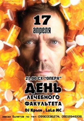 Тусовка самого огромного факультета в ЛГМУ! Для студентов, интернов и друзей! Вы усердно трудились, поэтому этим прекрасным весенним днем для вас будет праздник! Ну а 6 курс просто обязан прийти на последнюю тусовку своего любимого факультета!