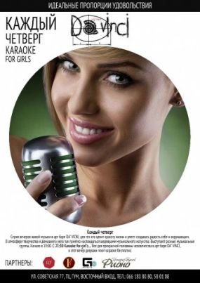 С 21:30 Karaoke for girl’s… Все для прекрасной половины человечества в арт баре Давинчи, в этот вечер девушки поют караоке бесплатно.