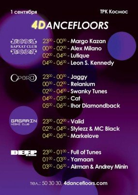 III International Event «4 Dance Floors» - международный ивент, родившийся в Луганске, посвященный электронной танцевальной музыке, расположенный на четырех танцполах. В предыдущие годы одновременно собирал в свои ряды представителей Великобритании, Германии и Украины. В 2012 каждый из танцполов/клубов будет представлять яркие представители того формата/стиля, в каком будет работать этот клуб в новом сезоне.