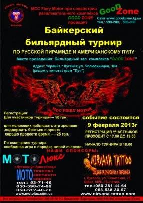 Дорогие друзья! Приглашаем всех принять участие в турнире по бильярду среди байкеров. Русская пирамида и американский пул.