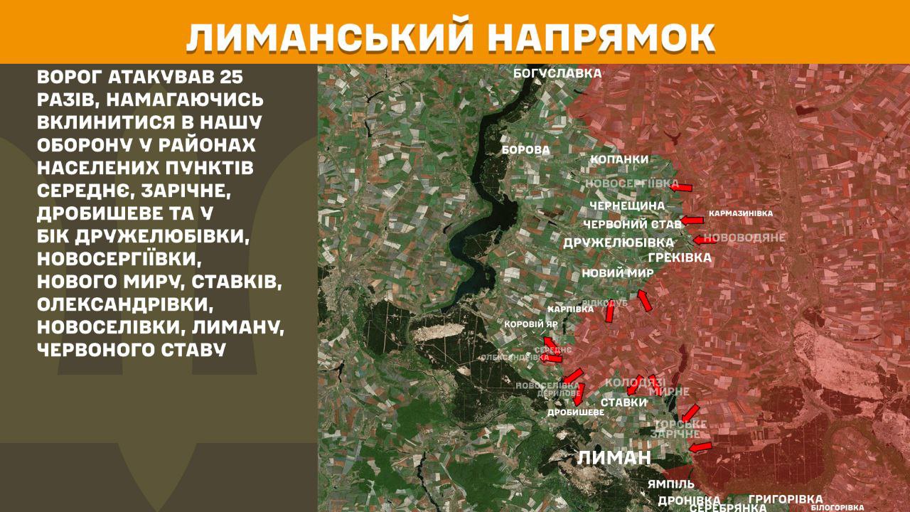 На Лиманському напрямку ворог атакував 25 разів, намагаючись вклинитися в нашу оборону у районах населених пунктів Середнє, Зарічне, Дробишеве та у бік Дружелюбівки, Новосергіївки, Нового Миру, Ставків, Олександрівки, Новоселівки, Лиману, Червоного Ставу.