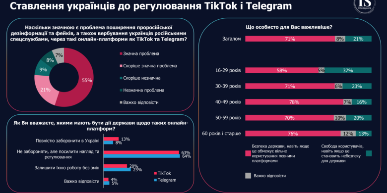 Більшість громадян України підтримують посилення державного нагляду та регулювання Telegram та TikTok. Про це свідчить дослідження Info Sapiens, передає Цензор.НЕТ. Дезінформація у соцмережах Так, 76% українців вважають, що поширення проросійської дезінформації через TikTok та Telegram є значною проблемою.  Соціологи зазначають, що це свідчить про те, що платформи, за допомогою яких люди спілкуються та розважаються, можуть бути інструментом зовнішнього впл...